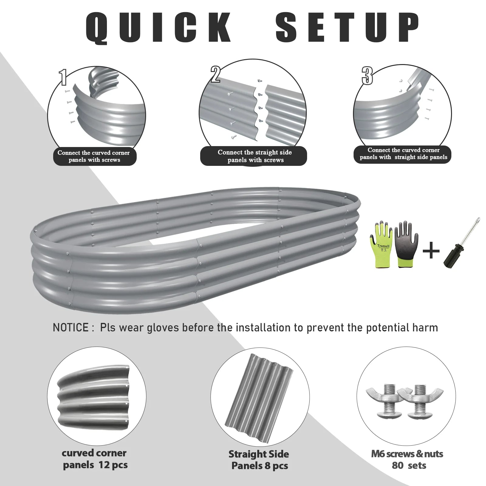 【Safety Features】①Anti-rust Coating, do not contaminate soil, safe for plants and humans; ②Oval shape, the raised planter box has rounded corner; ③Thickened crimped edge design, no sharp edges, smooth to the touch; ④ Gloves included; will not hurt your hand when installing or planting
