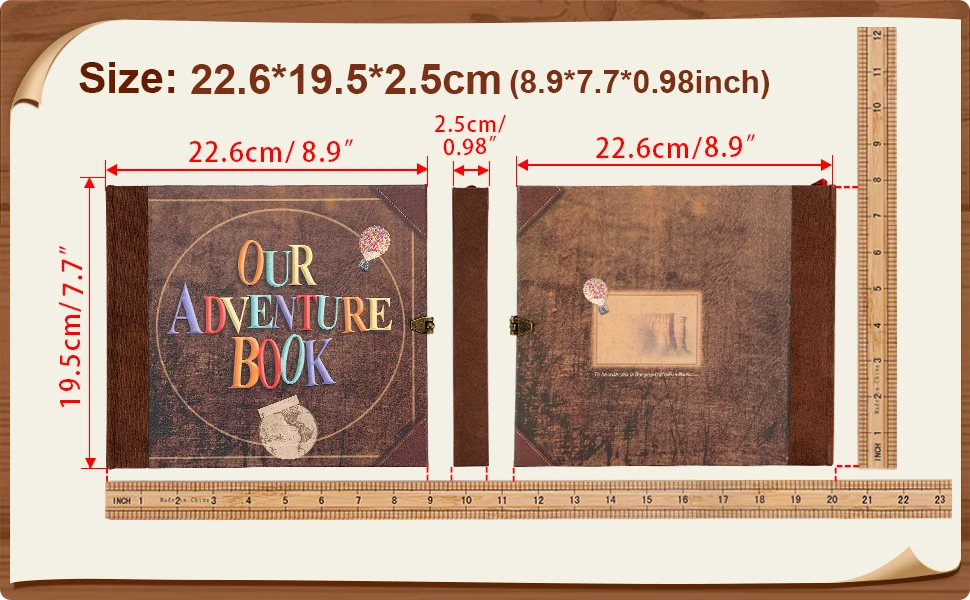 Scrap book for pictures:7.7"L x 8.9"W x 0.9"H. 73 sheets(146 pages) hold over 300 photos.Our Adventure Book Scrapbook has a sturdy craft paper bag on the back,can store stamps, travel tickets,etc.