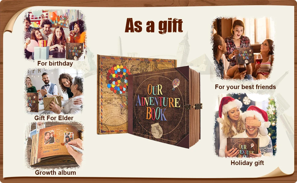 Date adventure book:You can DIY photos any way you want,made for a collection of retro-style souvenirs.It is a best gift memory book for couples. This anniversary book included pack with exquisite gift box x1, several bookmark cards, several stickers.