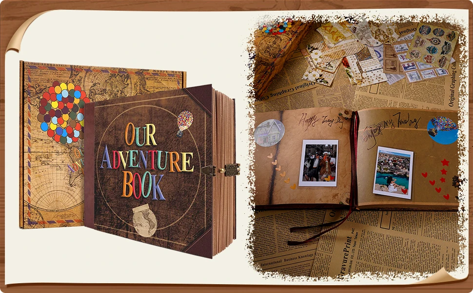Up house scrapbook design:Three-dimensional font cover and retro classic hardcover notebook diary.Made of thick craft paper, non-fading, each scrapbook contains a variety of different retro page styles.It also is a good gift for kids school photo album.